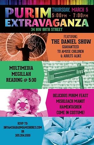 Chabad Miami Shores presents a Purim celebration featuring The Daniel Show, Multimedia Megillah, and a delicious Purim feast. Come in costume! RSVP to info@chabadmiamishores.com